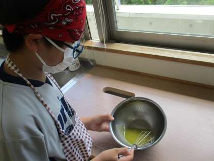 種類の異なる野菜、にんじん、ブロッコリー、キャベツのゆで野菜サラダを作りました。にんじんは水の状態から、ブロッコリー、キャベツは沸騰した状態からゆでるなど、野菜の種類によってゆで方が異なることを学びました。ドレッシングも自分たちで作りました。