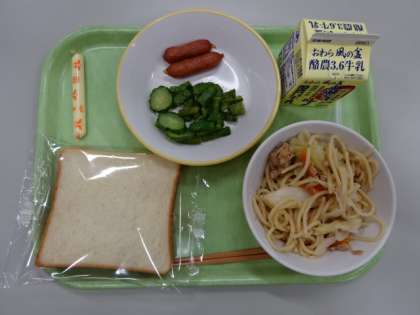 今日の献立は、ツナとキャベツのスパゲッティ、あらびきウインナー、アスパラサラダ、棒チーズ、食パン、牛乳 です。