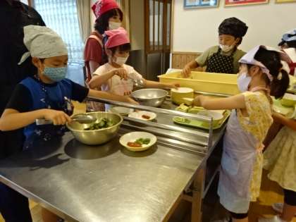低学年もすっかり給食の準備に慣れました。協力しながら手際よく盛りつけたり配ったりしています。