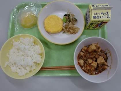 今日の献立は、マーボー豆腐、かにたま、ナムル、冷凍リンゴ、ご飯、牛乳 です。