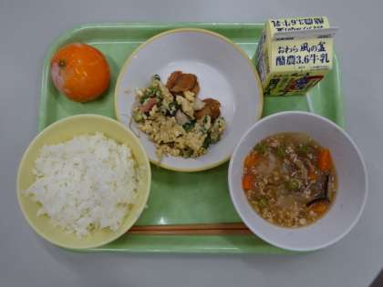 今日の献立は、冬瓜のそぼろあん、ほたての照り焼き、ベーコンとゴーヤの卵炒め、冷凍みかん、ご飯、牛乳 です。