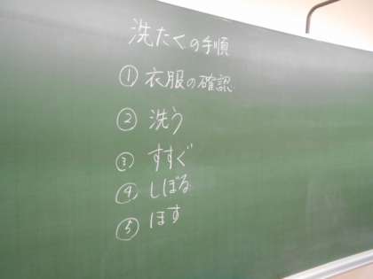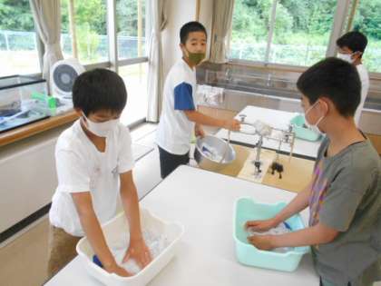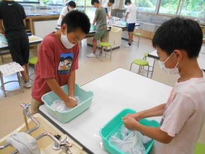 家庭科で洗濯の学習に取り組みました。手洗い、すすぎ、しぼり・・と作業を進めていました。