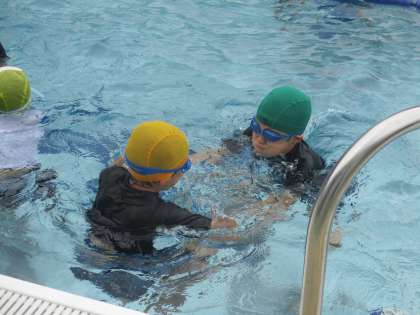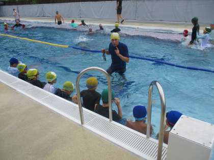 今日もたくさんの子供たちがプールに来ています。暑い中、入るプールはとても気持ちがよさそうです。今日は校長先生の水泳教室2日目です。空気を鼻から吐いて、口で吸う練習をしました。