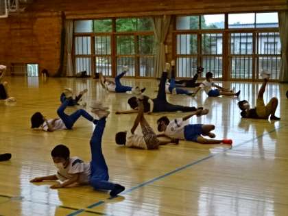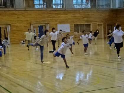 環境整備作業の後は、富山市体育協会指導員の方を講師にお迎えし、「親子ふれあい体操教室」を行いました。親子で体を動かしながら、スポーツに必要な体の動きを身に付けられるよう、ご指導いただきました。