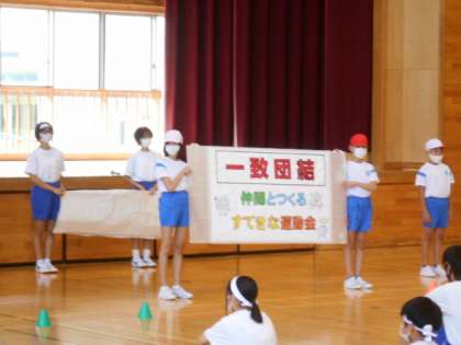 小中学生の全員が集まり、運動会に向けて小中合同の結団式を行いました。団役員の紹介やスローガンの発表がありました。