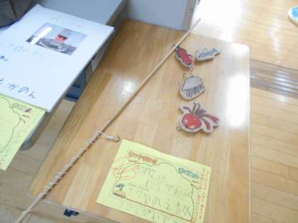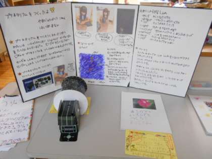各教室横のオープンスペースには、夏休みにがんばって制作した作品が並べられていました。