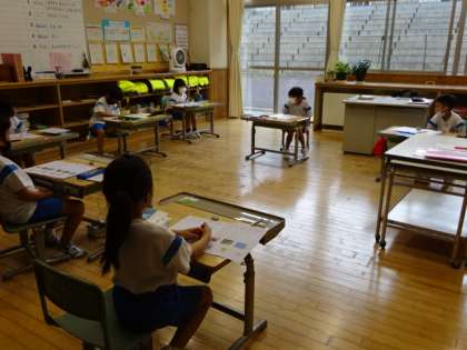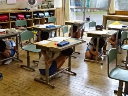 防災の日に合わせ、小中合同で防災訓練を行いました。初めて取り組んだ1年生は、放送をしっかり聞いてから、「まず低く」「頭を守り」「動かない」の3つの安全行動を、しっかりととり、身を守っていました。