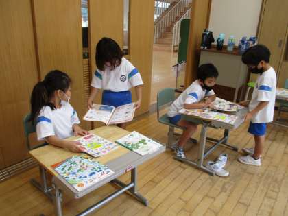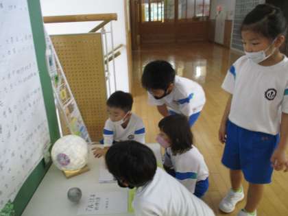 ○「校内夏休み作品展」を行っています。他学年の自由研究を見に行きました。