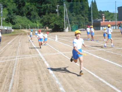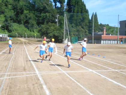 全校リレーの練習を行いました。子供たちは走る順番や、誰からバトンをもらって、誰に渡すのかを確認しました。