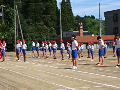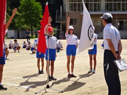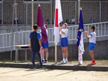 小中合同で、開閉開式の練習をしました。暑い日になりましたが、集中して話を聞き、流れや動きを確認しました。