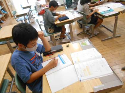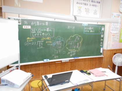 4年生は算数科で、わり算の筆算の学習に取り組みました。仮の商を立てて割りきれるかを考えることに気付きました。