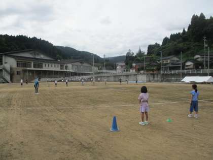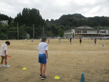 リレーのバトン練習を行いました。スムーズなバトンパスができるように、バトンを受ける時のスタートのタイミングを合わしたり、「はい。」の合図で腕を体の真横に出し、バトンを受けやすくする練習を行いました。