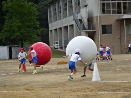 高学年の団体競技は「運べ!山田の特産品」。リンゴとてんころに見立てた紅白の大玉を、二人で協力して運びました。