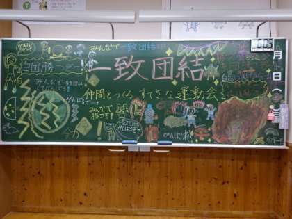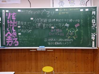 朝、黒板に子供たちのメッセージが書いてある教室がありました。運動会に向けて、気持ちが高まっています。子供たちのがんばりが楽しみです。