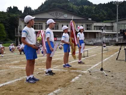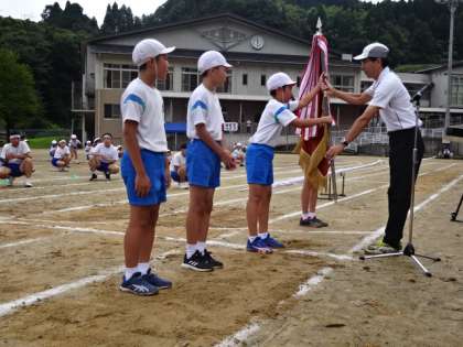 総合優勝の白団と、小学生リレー総合優勝の白団に、賞状と優勝旗、カップが手渡されました。