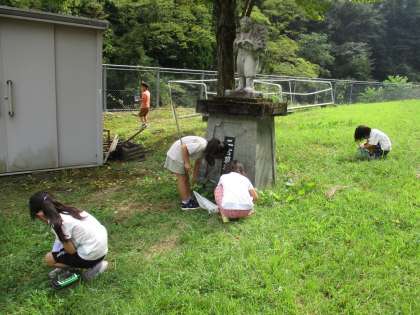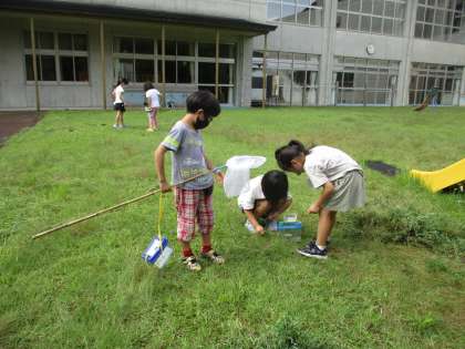 2学期は、生活科「○○となかよし」で、生き物(虫)を育てる学習を行います。今日は、虫かごや虫取り網を持って、芝生広場やグラウンドに出ました。