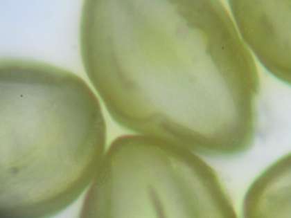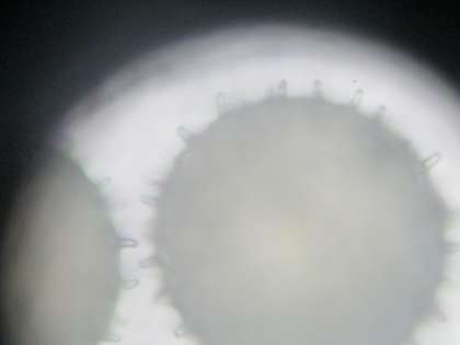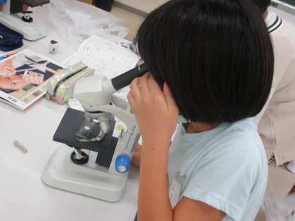 顕微鏡を使って、ヘチマとアサガオの花粉を観察しました。色や形が違うことを確認することができました。