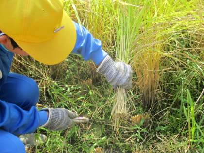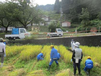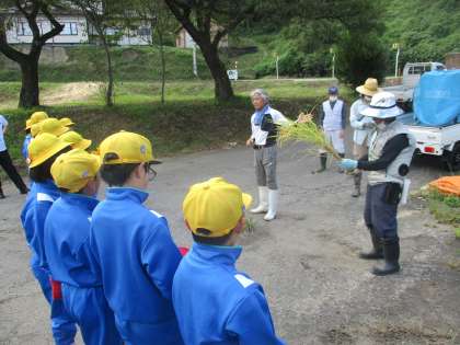 5月に植えた苗がすくすくと生長し、稲刈りを行いました。鎌で稲を刈り取り、脱穀する作業まで行いました。自分たちで育てたお米を食べるのが楽しみですね。また、これまで田んぼの世話をしていただいた地域の方々、ありがとうございました。
