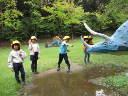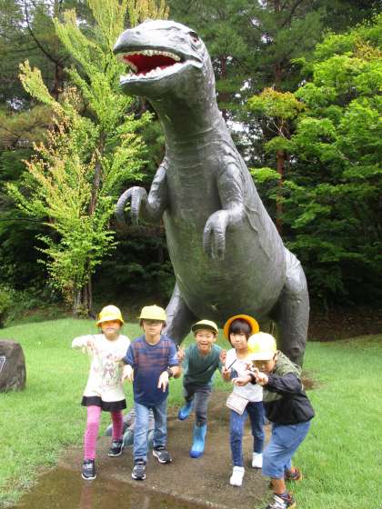 班ごとの記念写真です。好きな恐竜の前で「はい、ポーズ!」