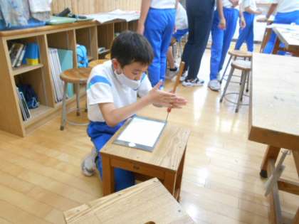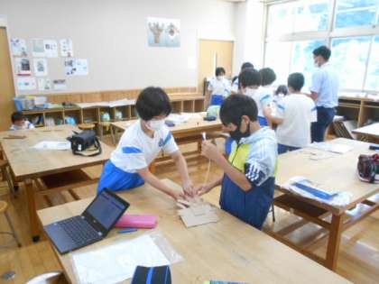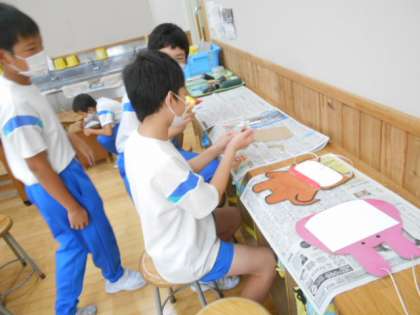 5年生は図工科の学習で、メッセージボード作りに取り組みました。糸のこぎりで切り取った部材を組み合わせて製作しました。