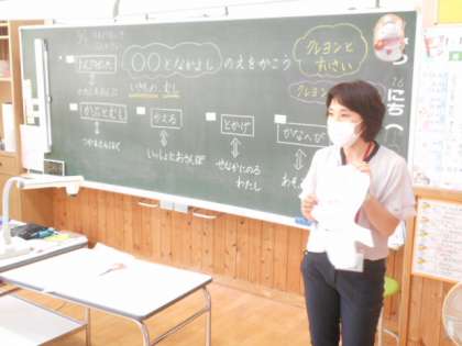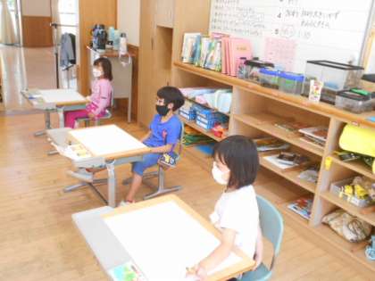 1年生は図工科の学習で、「生き物となかよし」という課題で絵を描きました。子供たちは自分が描きたい生き物を決めるのに思案していました。