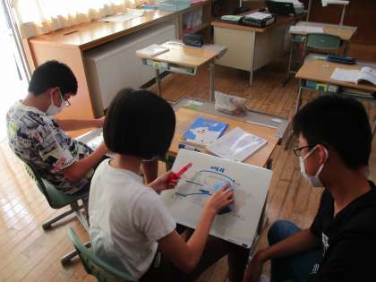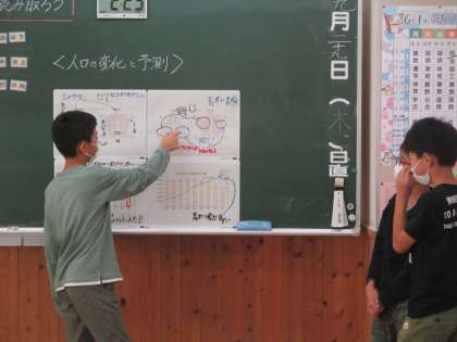 算数の学習で、人口ピラミッドや人口推移に関するグラフから、分かることや考えられることについて話し合いました。1番多い人口の階級や総人口に対する65才以上の割合を比べるなど、これまでの学習を生かしながら考えることができました。
