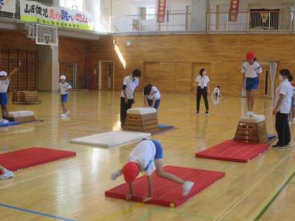 富山市体育協会から、スポーツ指導員3名が来校され、跳び箱の基礎・基本について指導いただきました。ロイター板での踏み切りや、跳び箱への手の付き方、腰を上げること等、跳ぶコツを身に付けることができました。