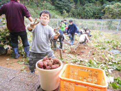 1,2年生は学校農園でサツマイモ掘りをしました。子供たちはどんなサツマイモがとれるか楽しみにしていましたが、思いの外、大きないもがとれて喜んでいました。