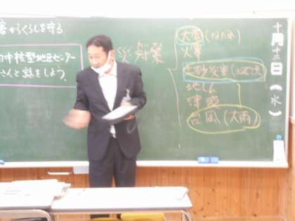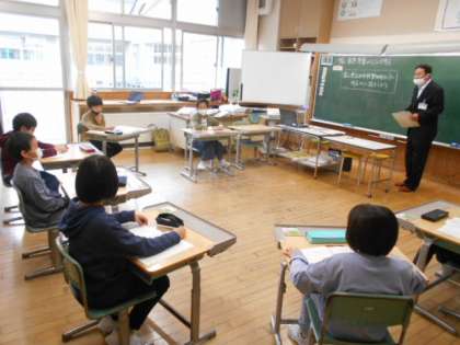 4年生は社会科で、「自然災害からくらしを守る」の単元を学習しています。今日は、山田中核型地区センターの職員の方から、実際に災害が起きたときに、山田地区では避難所の開設など、誰がどのような働きをするのかについて教えていただきました。