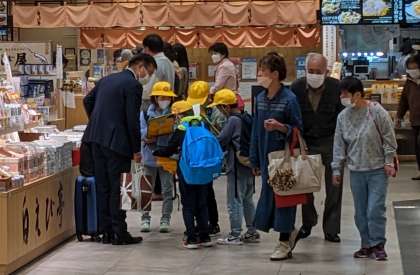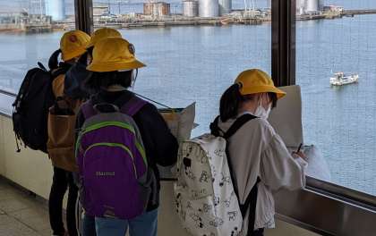 社会見学の様子です。富山港展望台と、とやマルシェでのインタビュー活動の様子です。