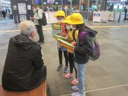 富山港線の電車の中と富山駅でのインタビューの様子です。