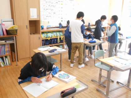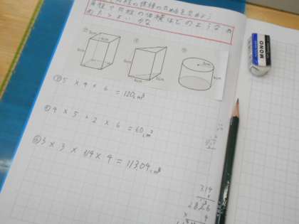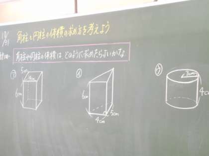 6年生は算数科で立体の体積を求める学習に取り組んでいます。底面積×高さの立式をして求めていました。