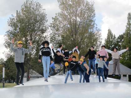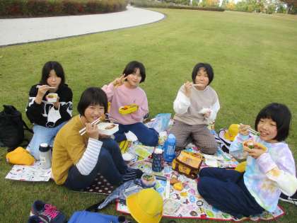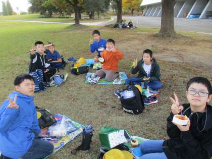 県総合運動公園で昼食をとりました。天候に恵まれ、青空の下でお弁当をいただくことができました。