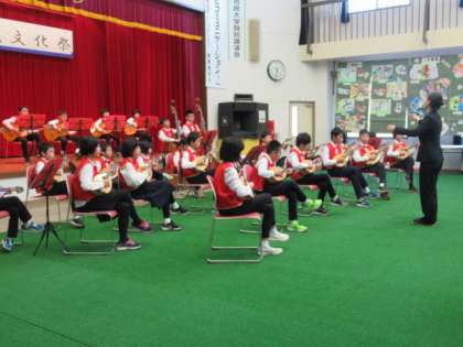4〜6年生がマンドリン演奏を、5年生が総合的な学習の時間で学んだことを発表しました。これまでの練習や学習の成果を発揮し、堂々と発表することができました。
