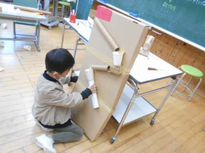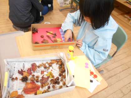 1年生は生活科でドングリや松ぼっくりなどの材料を使って遊びの道具作りに取り組みました。