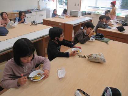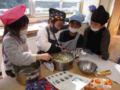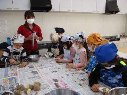 1,2年生で育てたさつまいもを使って、調理をおこないました。スイートポテトとサツマイモのコロッケふうみをつくり、食べました。子供たちは一生懸命にサツマイモの皮をむいたり、つぶしたり、形をととのえたりしました。