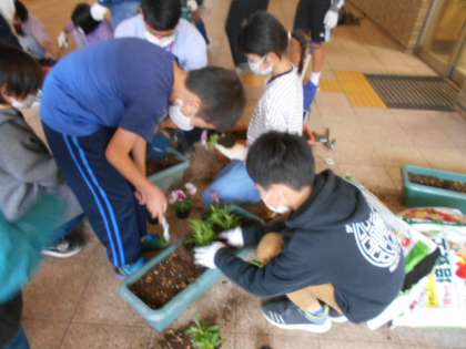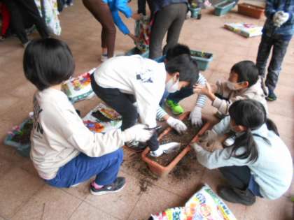 スマイル班の友達と一緒に、チューリップの球根やパンジー等の植え付け作業を行いました。仲間で仕事を分担して行いました。