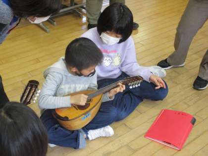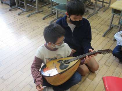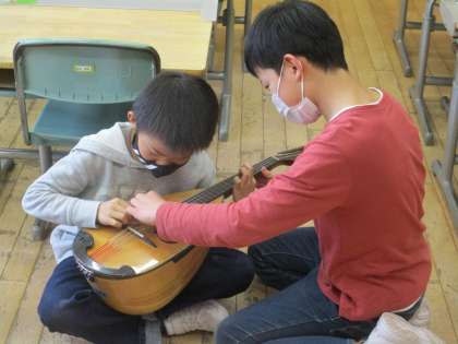 今日から5年生が主となってマンドリン練習を進めます。今日は3年生が見学にきました。3年生に音の出し方を教えています。