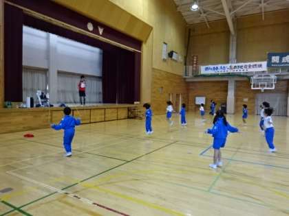 はじめに、全校児童で縄跳びパフォーマンスを鑑賞しました。迫力ある演技に圧倒されていた子供たちからは、思わず拍手や歓声があがりました。