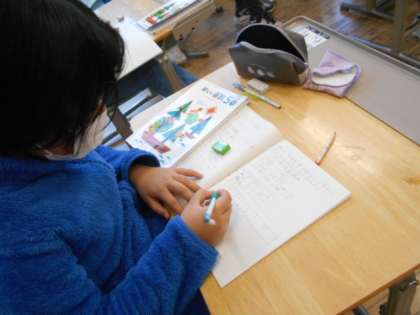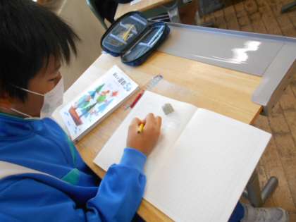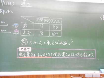 5年生は算数科で、単位量あたりの速さを求める課題に取り組みました。進んだ距離とかかった時間が違うときに、どのようにして比べるとよいかを考えながら学習しました。