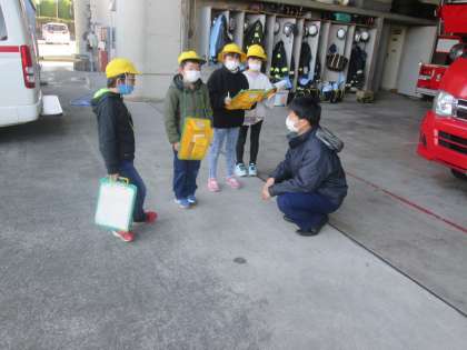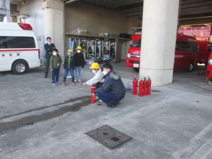 3年生は社会科の校外学習で、富山市民俗民芸村と富山市消防局に行きました。富山市消防局では、消防車両の見学や水消化器の体験をしました。職員の方から、実際火事を見たとき、どのように行動すればよいか説明を受け、シュミレーションしながら、水消化器で消火をすることができました。