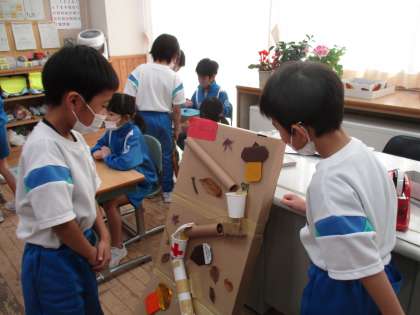 生活科で、どんぐりや葉等、秋の自然物を活用したおもちゃや遊びを考えてきました。今日は「あきいっぱい わくわくランド」をオープンし、2年生を招待しました。