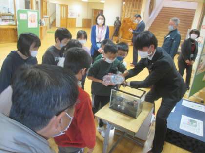 サクラマスの飼育体験教室があり、富山市水辺をきれいにする会から7名の方が来られました。教室では、サクラマスについての話を聞き、ペットボトルに入ったサクラマスの卵をいただきました。その後、卵を水槽に移し、子供たちは、興味をもってサクラマスの卵を見ていました。今後、卵がどのように成長していくか楽しみにしている様子が伺えました。