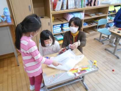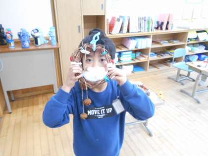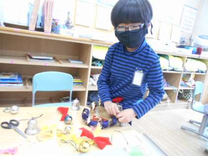 1年生はアサガオのつるを使ったリース作りに取り組みました。自分が用意したオーナメントを飾り付け、友達と見せ合いながら作っていました。