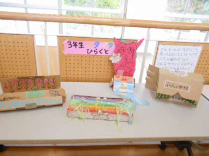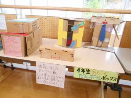 3,4年生は段ボールを材料にした工作に取り組みました。一人一人のアイデアが生かされた作品が飾ってあります。