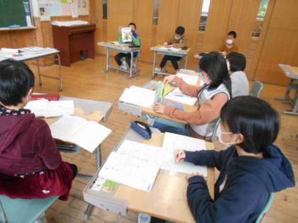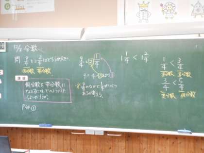 4年生は算数科で、大きさの等しい分数の表し方を学習しています。今日は、仮分数を帯分数に置き換えることを学びました。