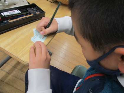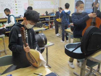 12月7日にマンドリン引退コンサート終えた6年生。これまで大切にしてきた楽器の、最後のお手入れをしました。6年生が使っていた楽器は、3学期から下級生に受け継がれます。名前シールをはがし、タオルで丁寧に拭き上げました。