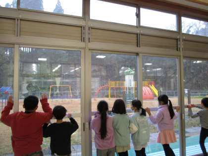 朝、フリーラーニングスペースで遊んでいた子供たちが、一斉に窓に駆け寄りました。初雪です。子供たちにとっては、待ちに待った雪。嬉しいですね。