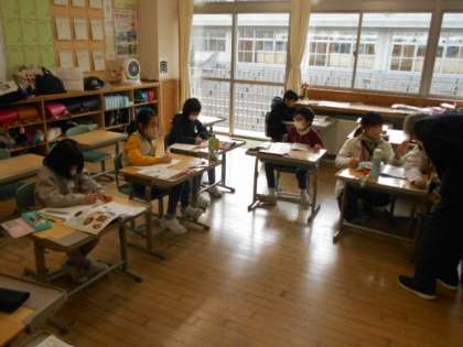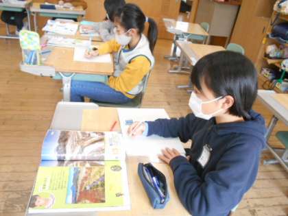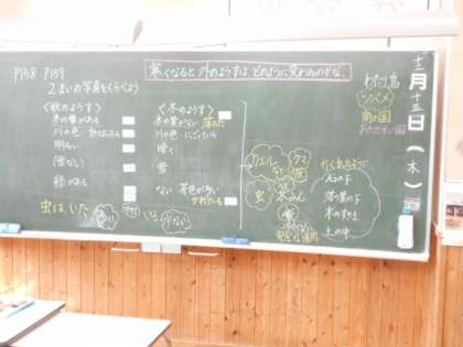 4年生は理科で、冬の生き物の様子について学習しました。身の回りの植物や昆虫等の様子を思い出しながら予想を立てました。