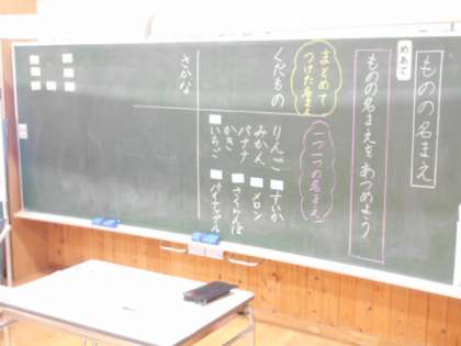 1年生は国語科で、ものの名前について学習しました。魚や果物には、どんな名前があるかを思い出しながらワークシートに書き込みました。